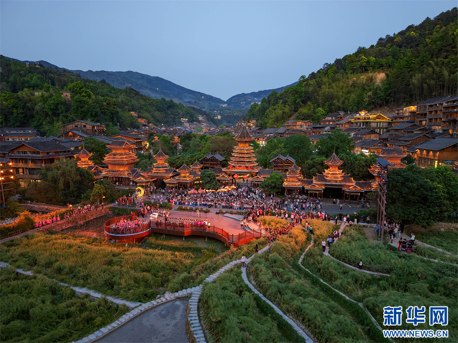 4月18日,游客在贵州省黎平县肇兴侗寨观看节目。新华网发(龙建睿 摄)
