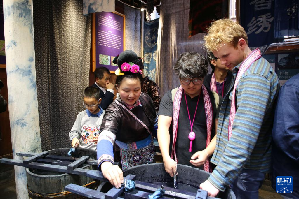 3月23日,外国游客在肇兴侗寨体验靛染。新华社发(吴光辉 摄)
