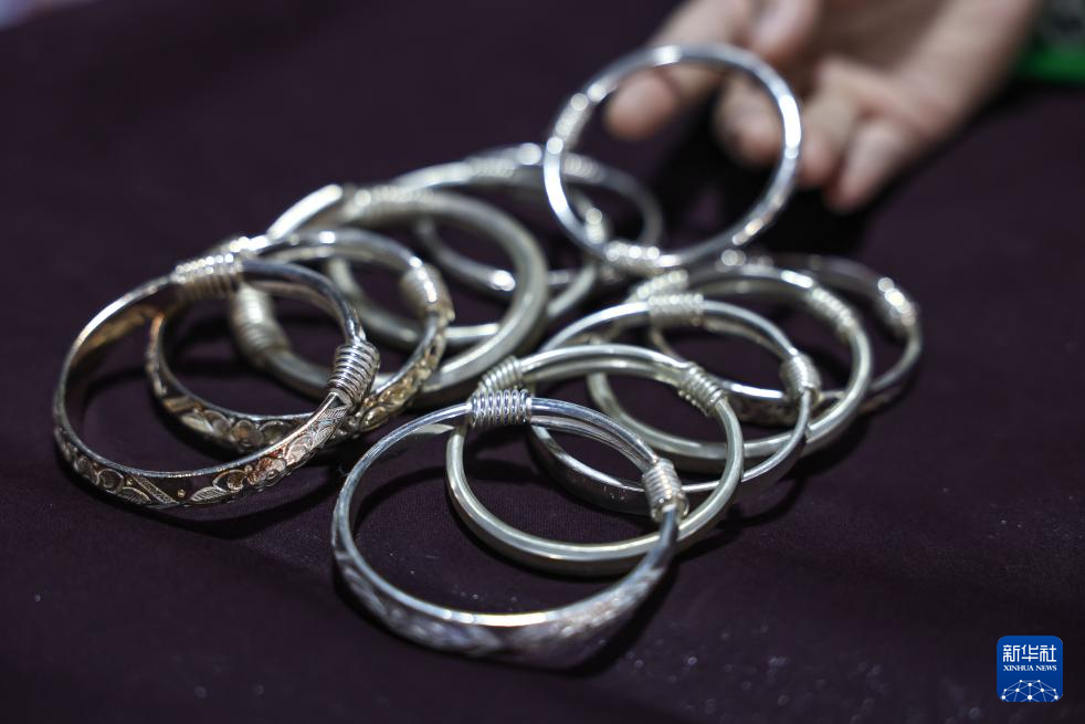 4月21日,贵州省黎平县水口镇的侗族姑娘杨爱鲜在展示父亲锻制的银手镯。新华社记者 杨文斌 摄