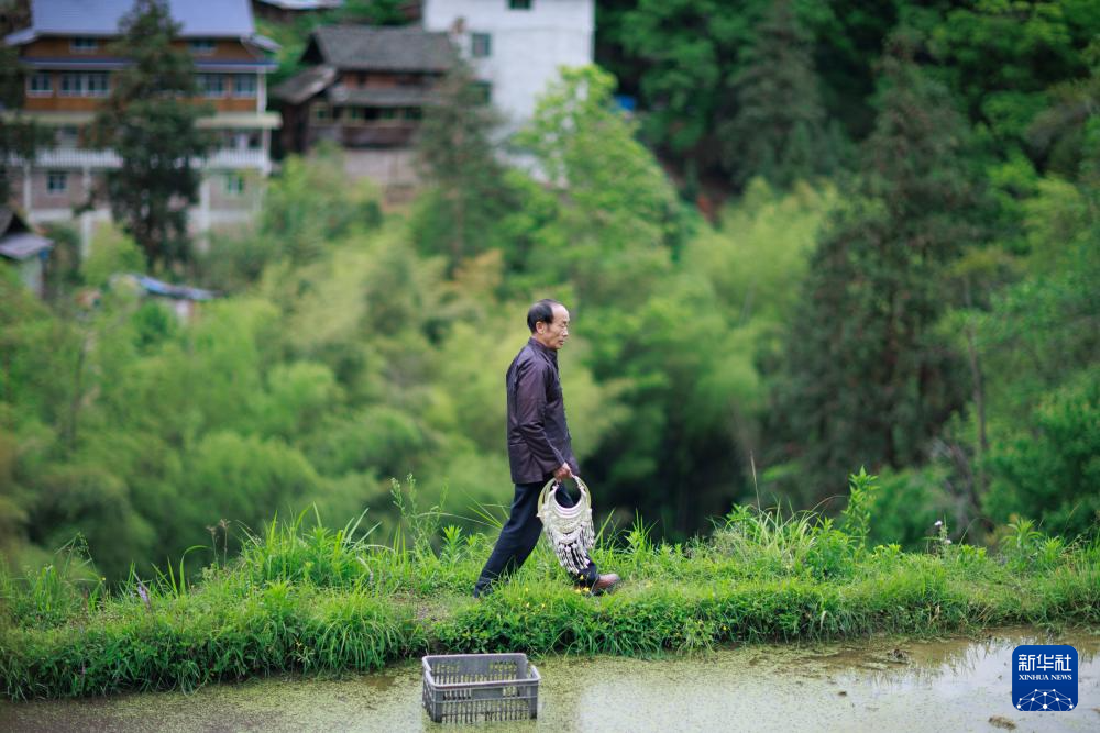 黎平县水口镇纪流村的银匠石传顺在给村民送银饰的途中(4月21日摄)。新华社记者 刘续 摄