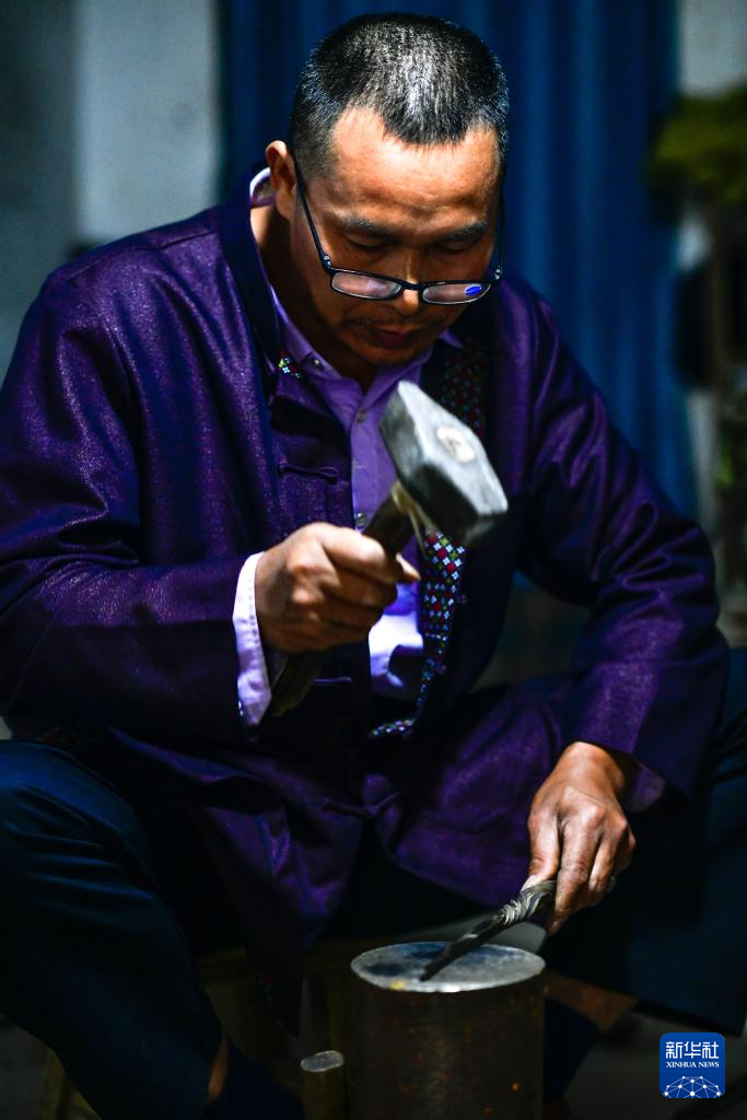 4月21日,贵州省黎平县水口镇的侗族银匠杨光儒在锻造银项圈。新华社记者 杨文斌 摄